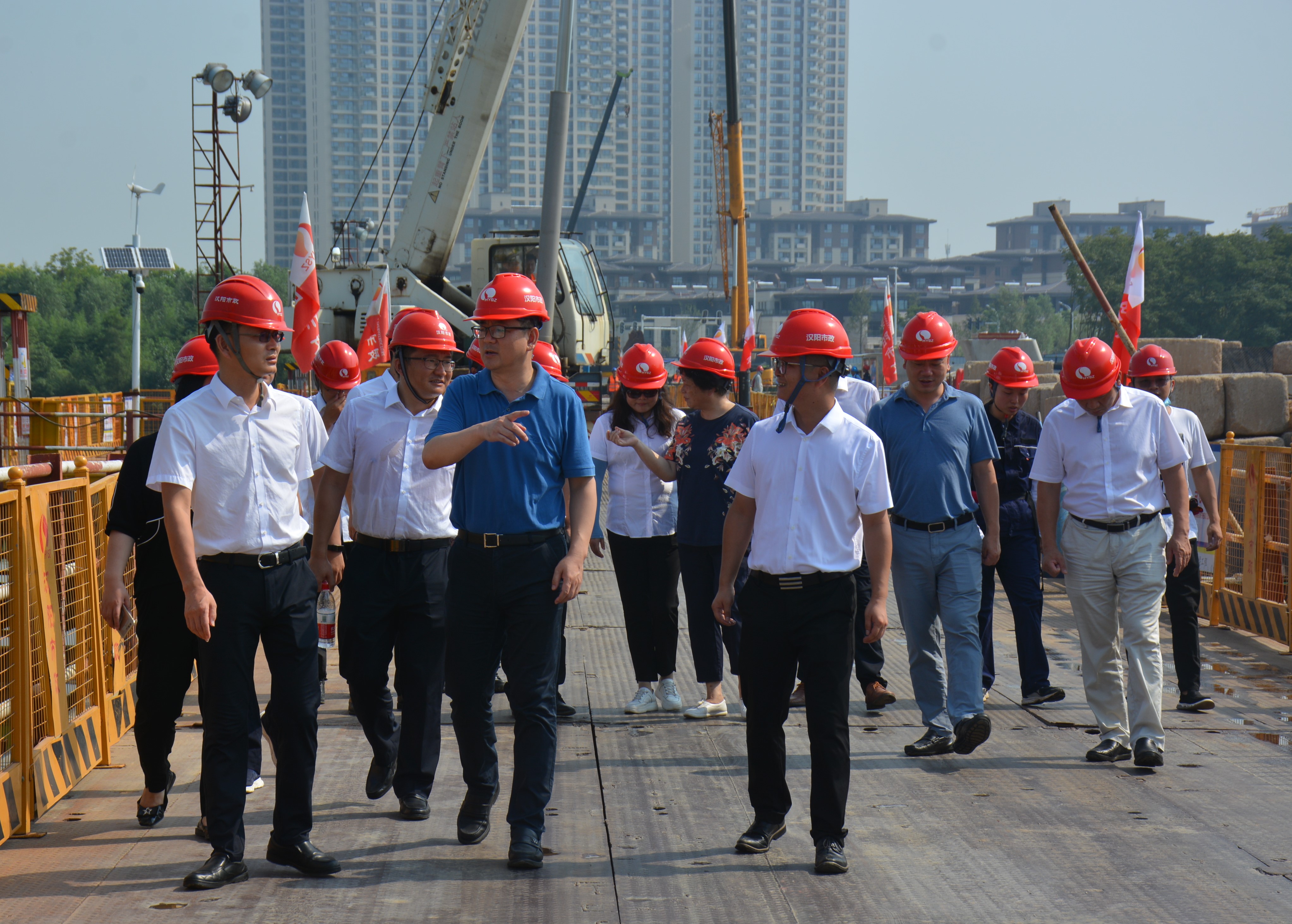 8月1日上午,漢陽市政集團公司黨委副書記、總經理虞志鵬,黨委副書記、紀委書記陳穎等領導一行來到東西湖區四路一橋項目部進行高溫慰問,向堅守在工作崗位上的一線員工表示親切的問候,漢陽市政天創公司支部班子成員陪同慰問。虞志鵬一行查看現場施工情況,與員工親切交談,細致了解項目施工進展及員工的生活、工作等狀況,對一線員工不懼高溫、積極工作的態度表示肯定,叮囑項目部做好防暑降溫工作,在確保身體健康的情況下全力完成項目進度。