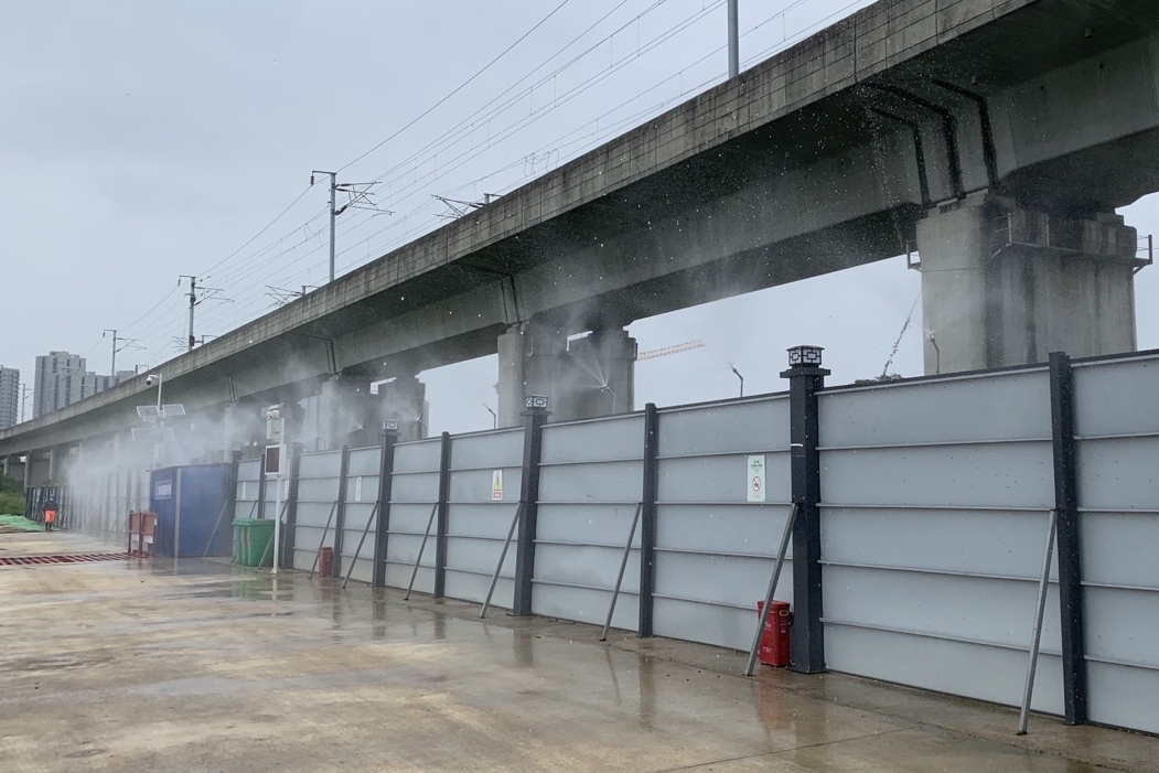 進入施工區(qū),項目封閉墻上,隨處可見安全文明標(biāo)志牌和提示語。施工區(qū)自動噴淋降塵系統(tǒng)不時觸發(fā),楊碧華饒有興趣地聽取了解。在浦興路施工場區(qū),揚塵監(jiān)控系統(tǒng)可以有效監(jiān)測現(xiàn)場溫度、濕度、風(fēng)速、PM10濃度和PM2.5濃度,“現(xiàn)場揚塵較大時,系統(tǒng)自動開啟運行,保證揚塵控制在合理范圍內(nèi)。”現(xiàn)場項目負責(zé)人介紹到。